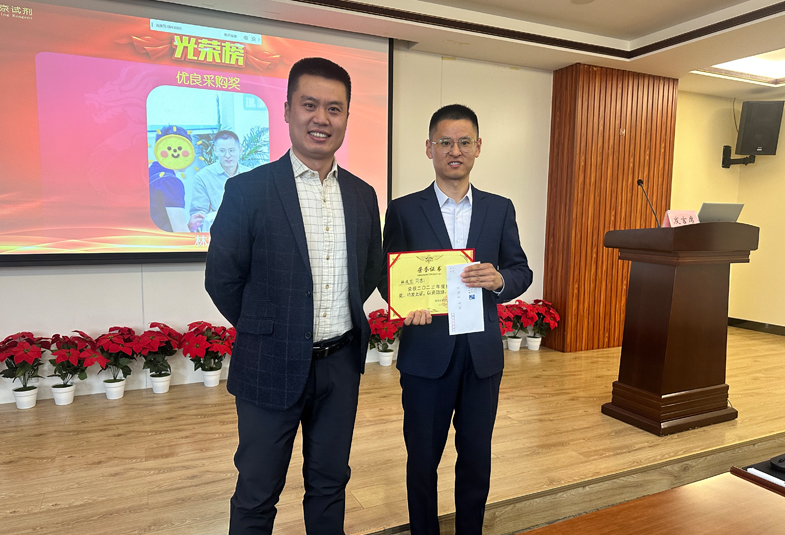 會議揭曉了上一年度“貓頭鷹計劃”,分別由田蜜、吳琦、宋立巖三位同事獲得,隨后會議頒發(fā)了2023年度顧客服務、營銷創(chuàng)新、藥輔推廣、售后服務、優(yōu)良采購及銷售精英獎,彭軍等11位同志分獲各項榮譽。