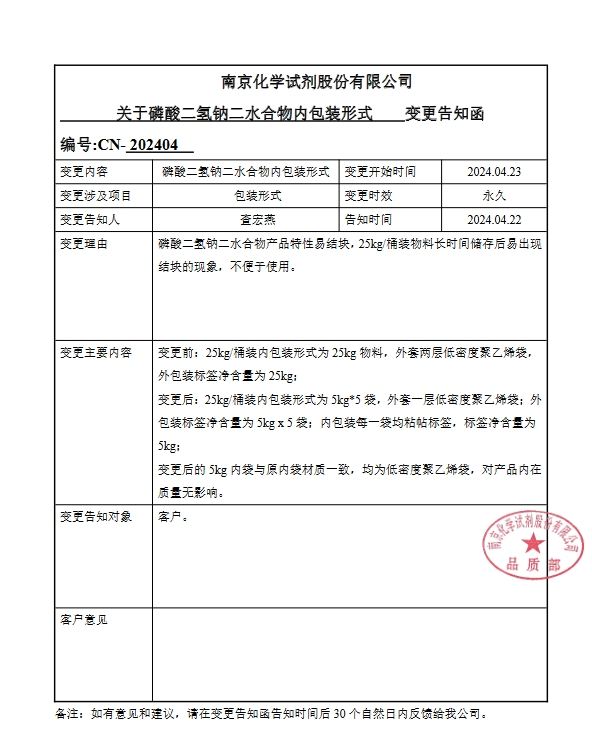 南京化學試劑股份有限公司:關于磷酸二氫鈉二水合物內包裝形式變更告知函