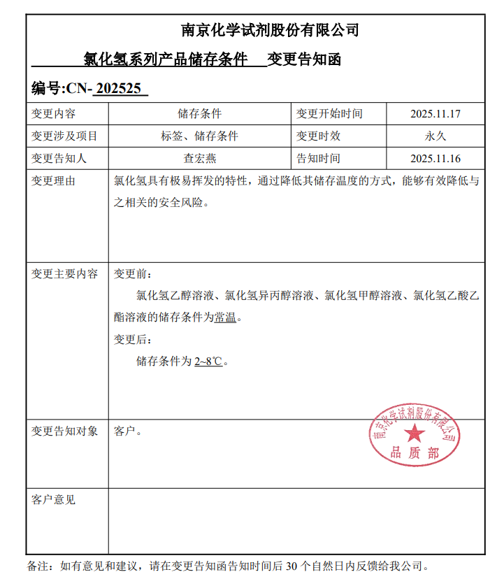 變更前: 氯化氫乙醇溶液、氯化氫異丙醇溶液、氯化氫甲醇溶液、氯化氫乙酸乙酯溶液的儲存條件為常溫。