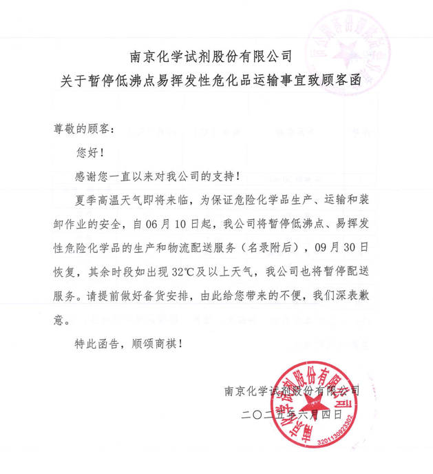 夏季高溫天氣即將來臨,為保證危險化學品生產、運輸和裝卸作業的安全,自 06 月 10 日起南試公司將暫停低沸點、易揮發性危險化學品的生產和物流配送服務(名錄附后)預計 09 月30日恢復,其余時段如出現 32℃及以上天氣,我公司也將暫停配送服務。請請提前做好備貨安排,由此給您帶來的不便,我們深表歉意。詳情如下: