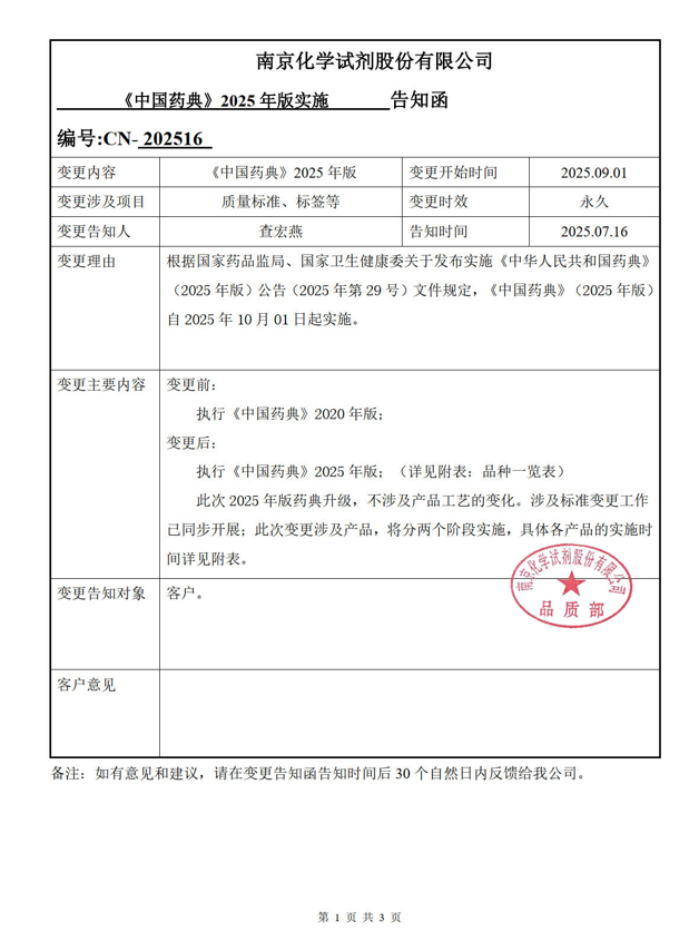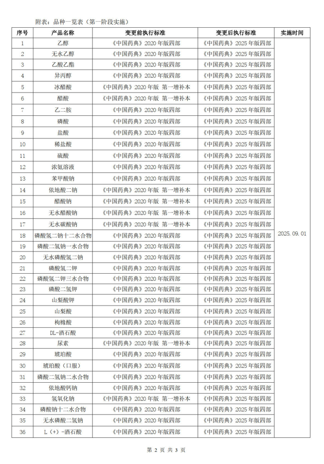 執行《中國藥典》2025 年版;此次 2025 年版藥典升級,不涉及產品工藝的變化。涉及標準變更工作已同步開展;此次變更涉及產品,將分兩個階段實施,具體各產品的實施時間詳見附表!