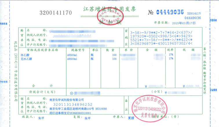 南京試劑商城的訂單按客戶要求均會(huì)開具中文機(jī)打的發(fā)票,發(fā)票明細(xì)為客戶實(shí)際購買商品的信息,發(fā)票金額為訂單總金額(含配送費(fèi)金額)。假如您對(duì)開票有個(gè)性化要求,請(qǐng)?jiān)谟唵蝹渥⒅姓f明。